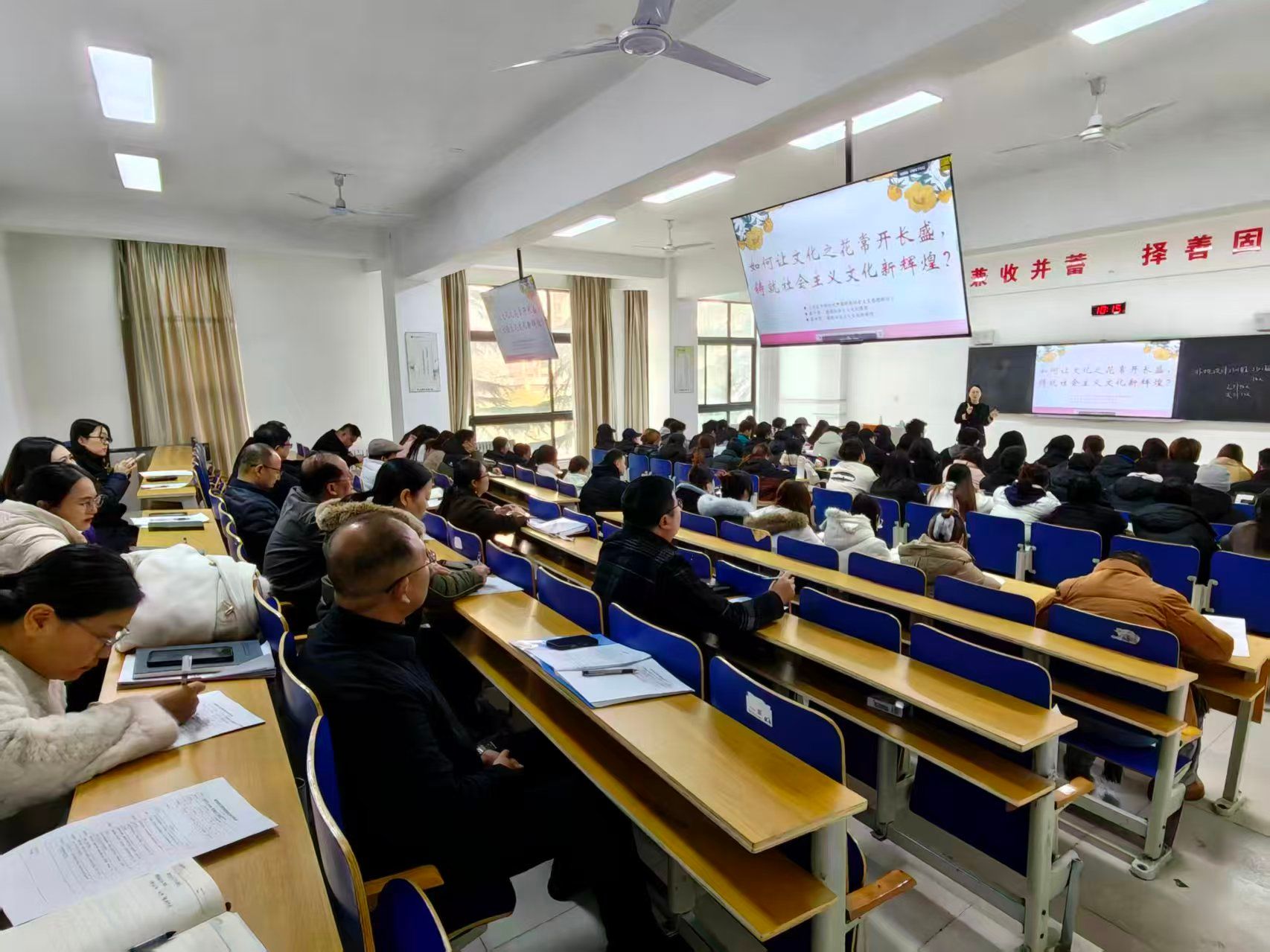 与会人员现场观摩了马克思主义学院郑媛媛老师主讲的《习近平新时代中国特色社会主义思想概论》示范课,课程以“让文化之花常开长盛”为题,系统梳理新时代铸就社会主义文化新辉煌的三维路径,紧扣课程重点,对标问题清单,回应学生关切,通过理论阐释、典型案例分析与互动问答等教学形式,有效引导学生深化对党的创新理论成果的理解。课堂气氛热烈,师生互动积极,展现出教师扎实的教学基本功。观摩人员全程认真听课,详细填写听课记录,全面记录教学过程、师生互动情况以及学生听课状态。