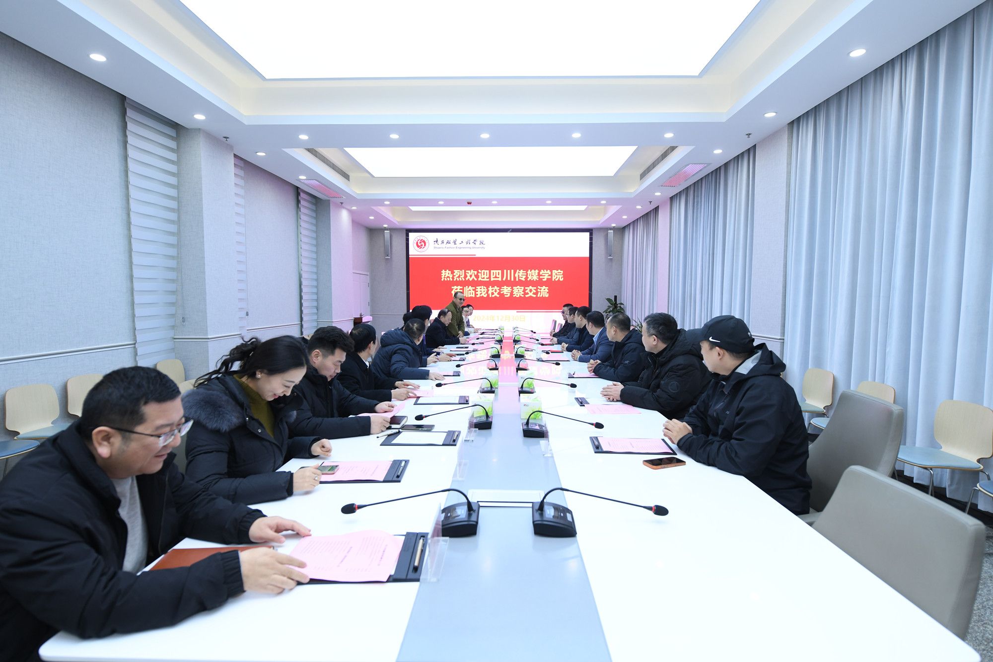 陕服新闻网讯(李文斌)12月30日,四川传媒学院党委常委、副校长、工会主席李巍,党委常委、校长助理、组织部部长樊潇雨,党委常委、校长助理、宣传部部长孙浩睿等一行7人来我校交流访问。学校董事长吕明、校长姜寿山、党委书记王岗、常务副校长黄新民、副校长潘庆才、刘运,校长助理李钊等率相关部门接待了来宾一行。