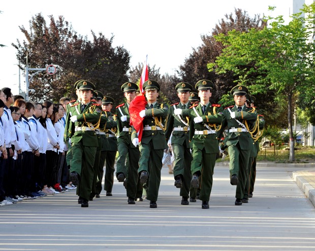 英姿飒爽的国旗护卫队员护送鲜艳的五星红旗进场